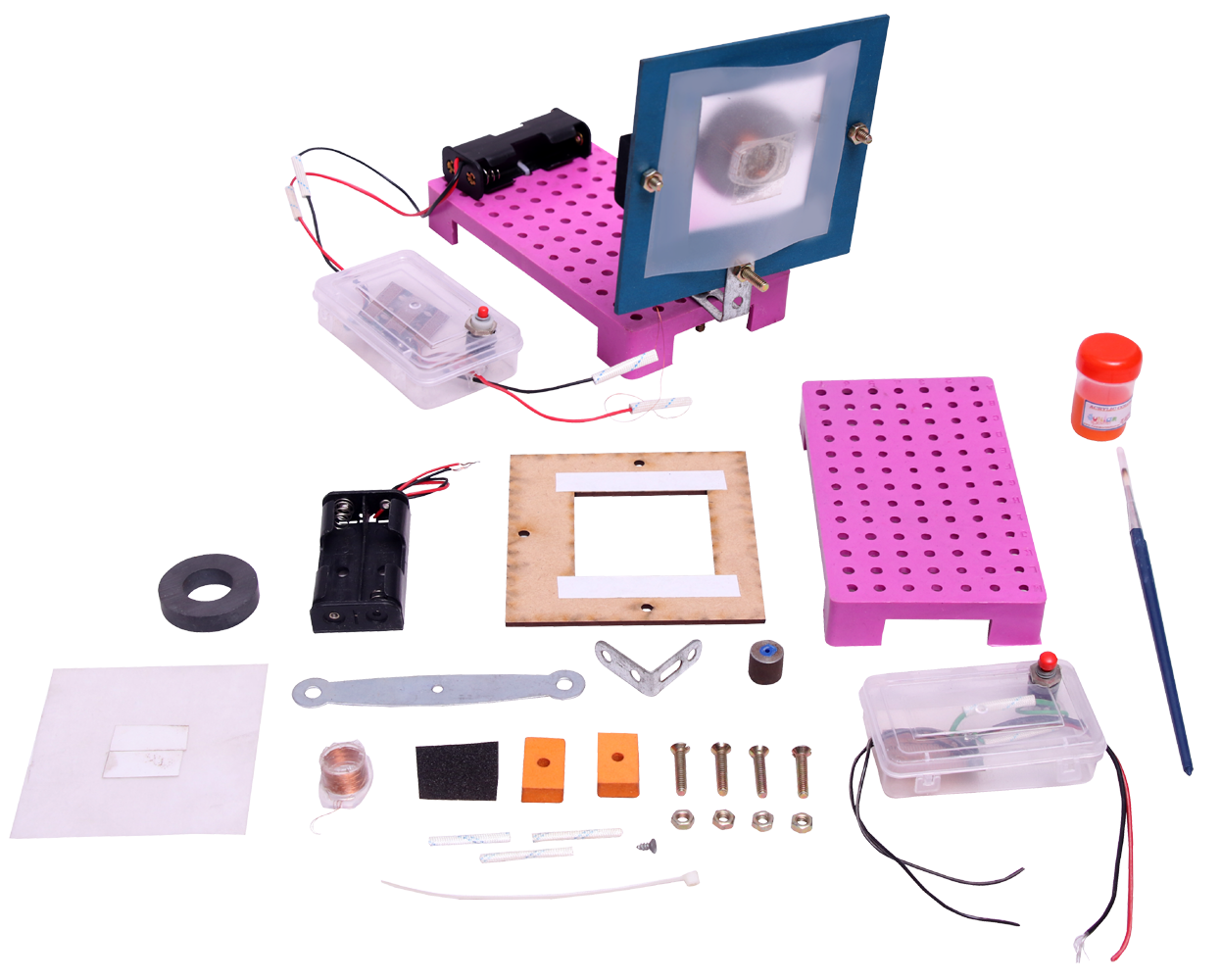 1.5V Double Battery Socket, Cable tie, Diaphragm (Transparent Plastic Paper), Double sided Adhesive tape, Foam Pieces (2 Nos.), Frame for Diaphragm, L brackets, L- Bracket, Metal Bracket, Metal Cylinder, Music Box, Nut/Bolt, Plastic Base, Push back switch, Red & White Wires, Ring magnet, Sand Paper, Screw, Voice Coil (42 Guage Insulated Copper Wire)