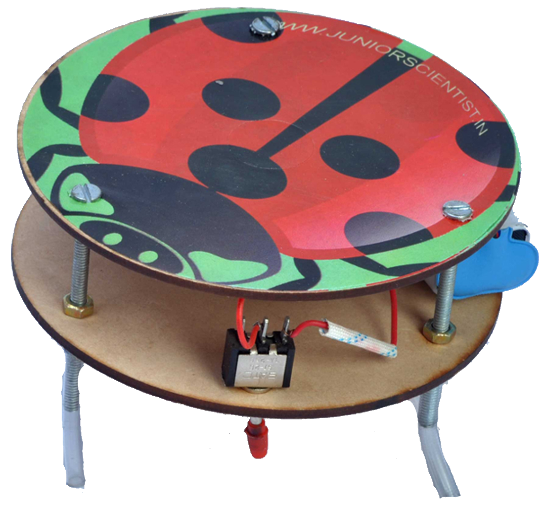 | What is in the Box | 9V Battery (Not included in Kit), 9V Battery Snap, Acrylic Plate (2 Nos.), Bolt, Bug Sticker, DC Motor, Foam piece, Nut, Off Center Mass, Plastic Feet, Product Manual, Sticky Pads, Switch, Wire |